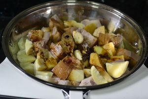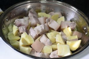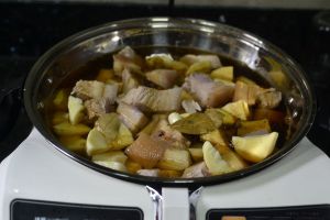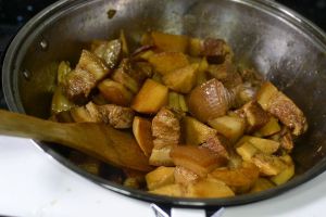 如果家里没有高压锅,那么在翻炒后就要添汤,大火煮开后转小火,待肉入味了,嫩了再出锅