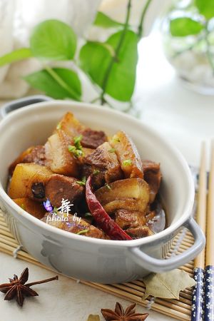 炒糖,锅中倒入少许油,两匙白糖,慢慢翻炒,注意要小火,待糖熬成茶色,倒入肉,大火翻炒,加入生抽,老抽,八角,葱,姜,待肉上色了盛出。 3.家中如有高压锅可放入高压锅中,压十五分钟左右。待肉都煮嫩了,放到炒锅里大火煮开后转小火,待油和汤分开时就可以出锅了