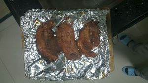 取出放进烤箱,建议烤盘下用锡纸垫底,上管,中下层,220度,25分钟,中途记得翻面。