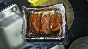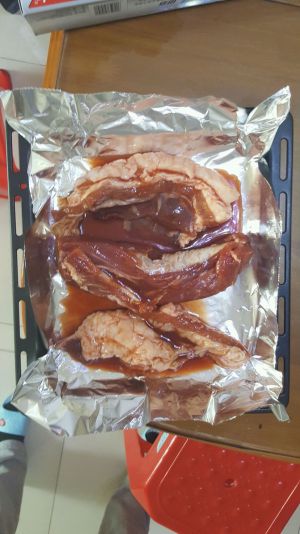 将密封盒里腌制了一晚上的五花肉拿出,用锡纸包裹,放进烤箱上下火230度烘烤30分钟,之后拿出来刷上蜂蜜再放入烤箱降至180度烘烤20分钟!