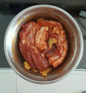 把五花肉洗干净后加入各种配料,洋葱要切片拌进去,放置一个晚上。