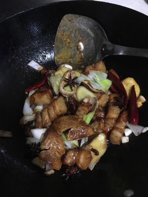 加少量油,把冰糖融化,加入五花肉,翻炒。加入葱姜蒜,干辣椒,八角,陈皮,翻炒。后加入水没过五花肉。