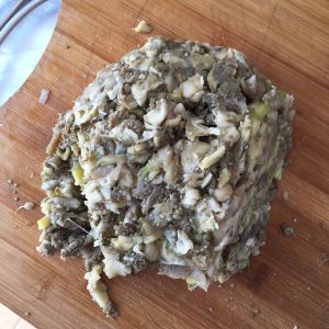茄子凉凉后,把茄子的水挤一挤,稍微切一切。