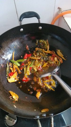 之后油热后将配料放入后,炒香,把红油放入,炒出香味,把鱼片炒5分钟。
