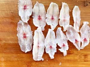 鱼切片,鱼排和鱼头切块,分开放。码上盐巴、豆粉和料酒
