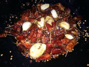 炒完虾的油不倒,直接下入干红辣椒,大蒜片,葱段,花椒,翻炒出香味