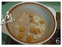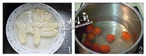 板粟氽汤去皮,鹌鹑蛋煮熟后去壳备用。