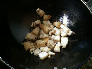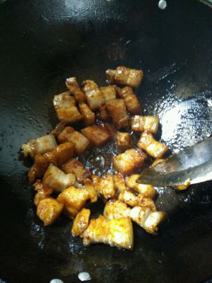 将五花肉放置锅中炒啊炒炒至出油,要多炒一会,这样出油多些也就不会腻了。
