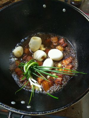 加老抽翻炒一下后,再加入水。放葱结,鸡蛋。