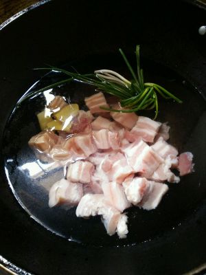 准备上好的五花肉,切成小块备用。