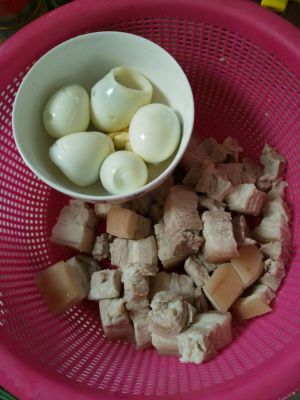 选用上好猪三层肉,切成麻将大小,用加了少许料酒的清水泡15-25分钟以去血水和腥气(这样肉就不用不飞水了);