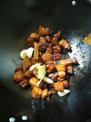 肉变色后放2段葱,几片姜,八角大料,一点点胡椒粉,酱油(要是老抽就放2匙,生抽4匙);