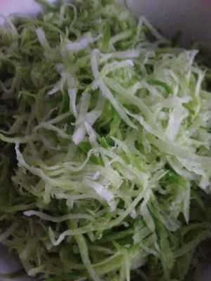 青萝卜擦成丝儿,用干净布挤挤水,尽量的挤,其实要是直接用青萝卜干味道更好!