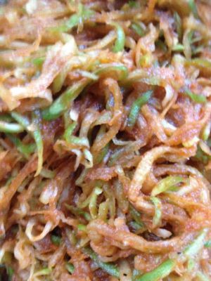在挤干的萝卜丝儿里加盐,糖,金刚山辣酱,蒜末姜沫,拌匀就好了。很下饭呢!