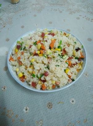 锅里放少量油,先将玉米和胡萝卜放入锅中翻炒放盐,再加入火腿香肠和鸡蛋,翻炒出香味后将米饭放入锅里一起翻炒均匀,最后加入鸡精和葱花,就可以起锅!