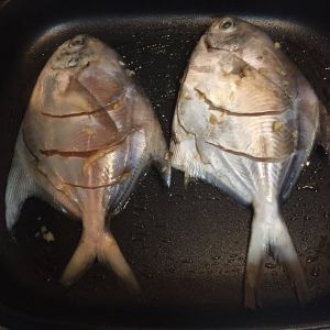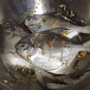 用黄鱼也很好,鲳鱼不是很容易入味。先把鱼收拾干净,身上划开,用盐、姜、料酒喂口。时间至少半小时,入味才会好吃。
