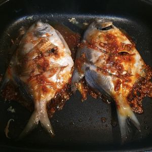 炸好后,把调味料过滤掉,只留炸过的油。炸过的油带有浓浓的花椒大料香味哦(下称料油)。 腌好的鱼,放在铺了油布(或锡纸)的烤盘上。用毛刷蘸料油刷在鱼的表面,油尽量多刷一些。刷好后放入预热好上下火230℃的烤箱中层,烤15分钟左右。