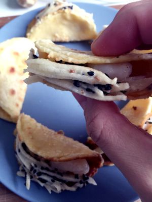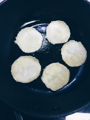 鸡蛋打散混入面粉搅拌均匀,加适量热水揉成团,醒面15分钟; 将面粉做成大小一样的剂子,擀成大小一样的饺子皮; 国内油烧热,小火,放饺子皮,煎至两面金黄; 将煎好的饺子皮对半折叠,用碗(或其他重的东西)压住定型,待用。