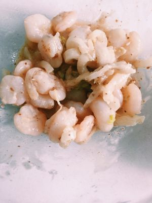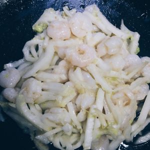 虾仁热油爆炒,加切成丝的白菜小火炒,放适量盐。