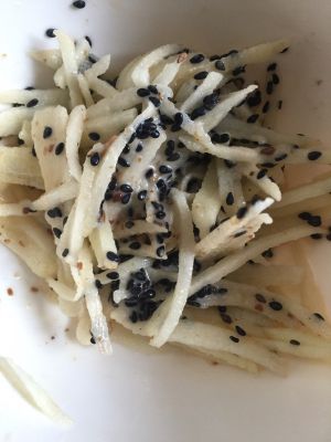 先将虾仁菜丝裹入饺子皮,再放苹果丝即可