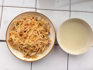 煮面,煮熟后凉水过下,用香油拌下,防止粘连(这个时间比较赶的,可以提前一天晚上煮好放到冰箱保存)