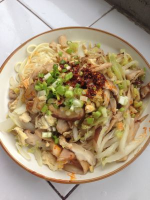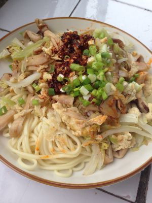 把炒好的素菜,鸡丝,铺在面条上,加蒜末,葱末,生抽,盐,醋,糖,油辣椒。美味素鸡丝凉面拌匀就可以吃啦!(以上菜谱为一人吃的分量)