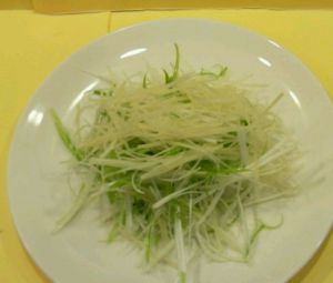 大葱一剖两半,细细切丝,然后摆盘备用。