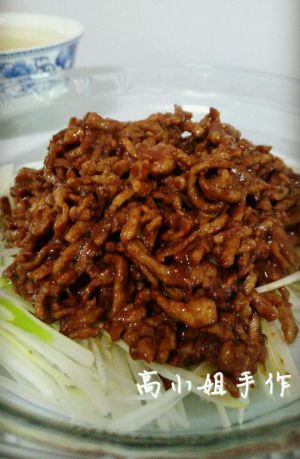 当当,肉丝装盘码好,快手京酱肉丝完成啦!看起来也是很高大上滴,关键是超级简单,别再说自己不会做菜啦,小伙伴们快带上围裙试试吧!