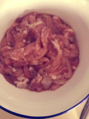 里脊切丝 加半个蛋清 少许料酒 抓匀