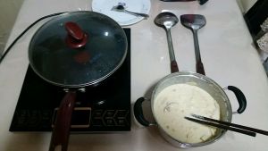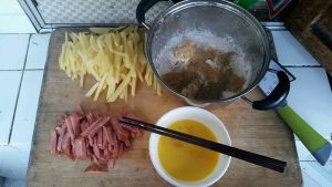 土豆,香肠切丝 打好鸡蛋备用 面粉,淀粉2:1比例
