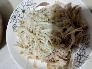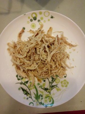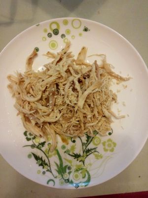煮好的鸡胸撕成均匀的条状,装盆备用