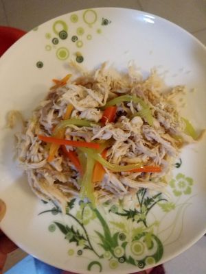 鸡胸肉煮熟,撕成丝,加一些自己喜欢的食材一拌就OK了,高蛋白低脂肪,不长肉,尽可以放心吃好了。