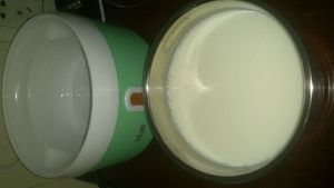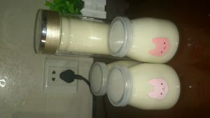 把容器用开水消毒后,牛奶加到温热倒入酸奶桶中,大约手心温度时加入菌粉,用筷子搅拌均匀,放入酸奶机中