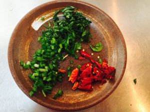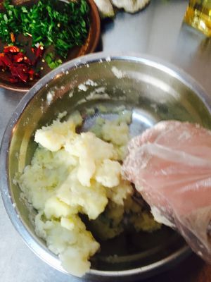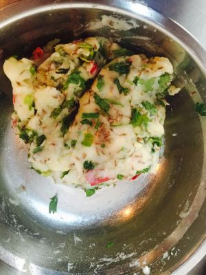 将香菜段、香葱段、干辣椒段和孜然粒和土豆泥混合均匀。