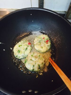 土豆饼先蘸蛋液,锅内放油加热,煎到两面上色即可。