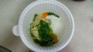 加些许面粉,以和鸡蛋十字交叉拌匀后,没有汤水为宜,喜欢软糯就多加点面粉,万一水分不够了可以再加鸡蛋,或少许水,一定不能太干,否则影响口感;