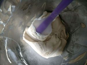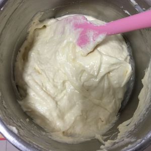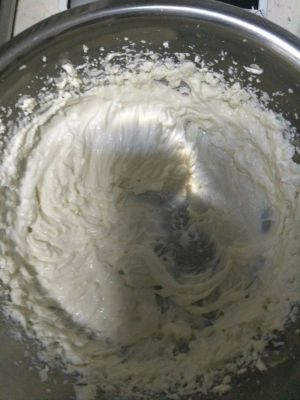 淡奶油打至6分发,即稍有流动性,然后和奶酪糊混合均匀。