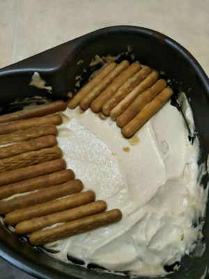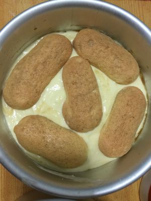 倒入一层提拉米苏奶酪糊,然后再铺一层饼干再倒提拉米苏糊。