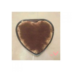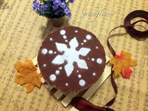 脱模后的提拉米苏均匀的撒上防潮可可粉,可以再撒些防潮糖粉,可以自己买花模,也可以用白纸剪出图案。