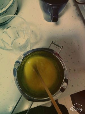 蛋黄加糖霜隔水加热 加热到80度 放入泡软的吉利丁片 使吉利丁融合在蛋液里