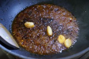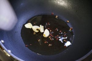 起锅倒些许油,冷锅加入蒜瓣和花椒,这样花椒不容易炸焦。