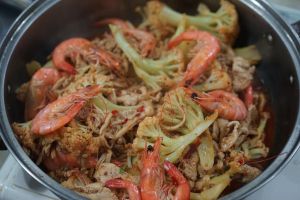 倒入肉片翻炒,将肉片炒熟。接着将之前焯熟的花菜金针菇玉米鸡腿菇虾青蛤全部倒入锅内翻炒,将调味料和食材混合均匀即可出锅。食材不能加热太久,青蛤和瘦肉容易变硬,花菜容易变得太软。