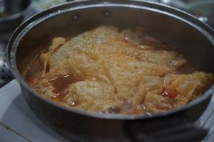 吃完食材之后,我们可以往锅里加一些开水或者准备好的青蛤汤,放上电磁炉加热涮豆腐皮吃!一本满足!
