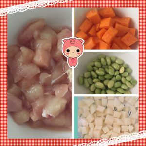 鸡脯肉切块,用料酒,盐腌制10分钟,土豆,胡萝卜切块备用,毛豆剥好备用。