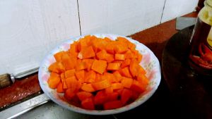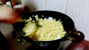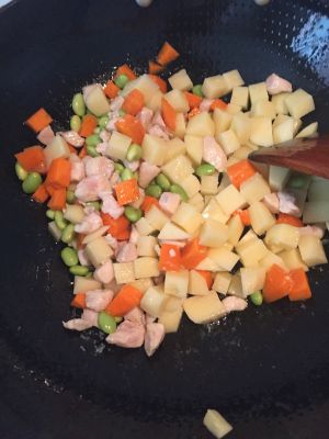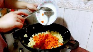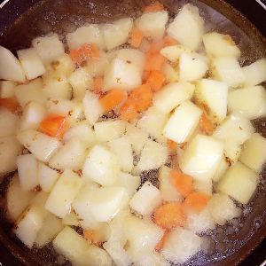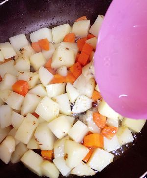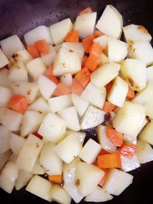 锅烧热,放土豆,胡萝卜,炒至两面金黄色