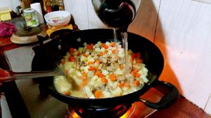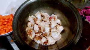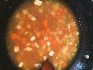 盖上盖煮,煮熟了,再放鸡肉丁,煮开