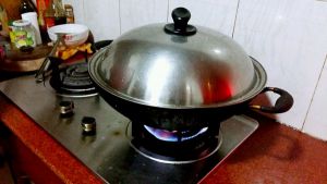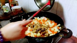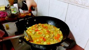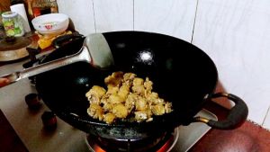 土豆和红萝卜均炒熟后,再加入事前已炒好的鸡翅,一起炒