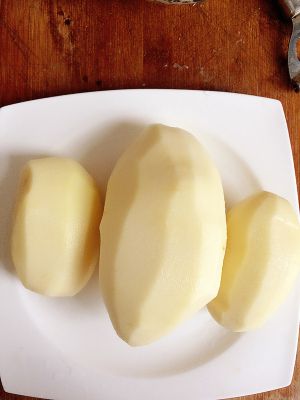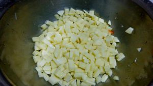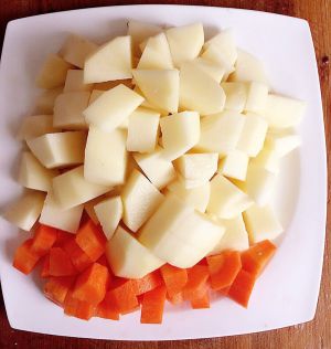 土豆削皮,泡水洗掉表面的淀粉,然后切丁或切块