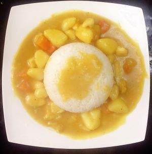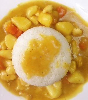 小碗装满米,倒扣在盘中,旁边加点咖喱汁,即可
