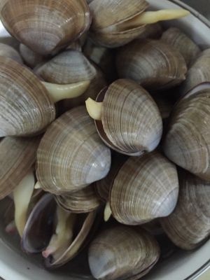 蚬子开水抄了一下,放入等量啤酒浸泡,为了去腥